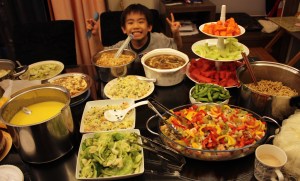 So, here’s a picture of all the different kinds of food that everyone brought (And Elijah too – he LOVES to be in pictures). So exciting! Home made Taiwanese food! Something I hadn’t had in this country so far. Awesome! I can’t remember what everything is, but there was ma po tofu. Yum! Bamboo root. Several kinds of noodles, and fried rice, and fruits and vegetables, and lots of other delicious things.