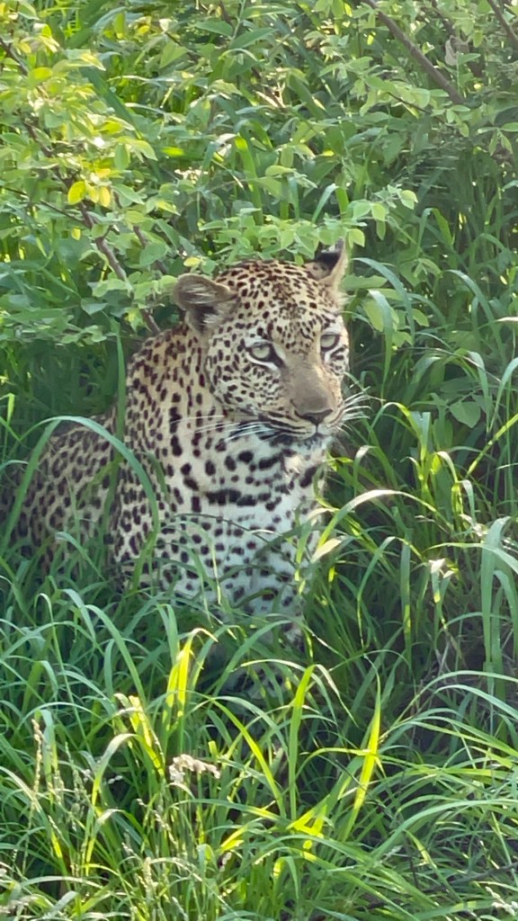 And sure enough, in the next tree over, I spotted our first leopard! Wow! In a tree! Our guide drove closer to the tree, and we watched this beauty climb down off the tree. We followed her into the brush with the vehicle as she jumped down. Apparently there are some types of animals that guides are allowed to follow into the brush and others they aren’t. Cats can be followed. We finally found her huddled down next to a bush, and our jeep got so close to her on my side of the car, I probably could have touched her if I put my hand out. Don’t worry, I would NEVER do that. Number one rule of safaris, DON’T STAND UP, and don’t try to touch animals. Someone told us leopards are small… NOT true!