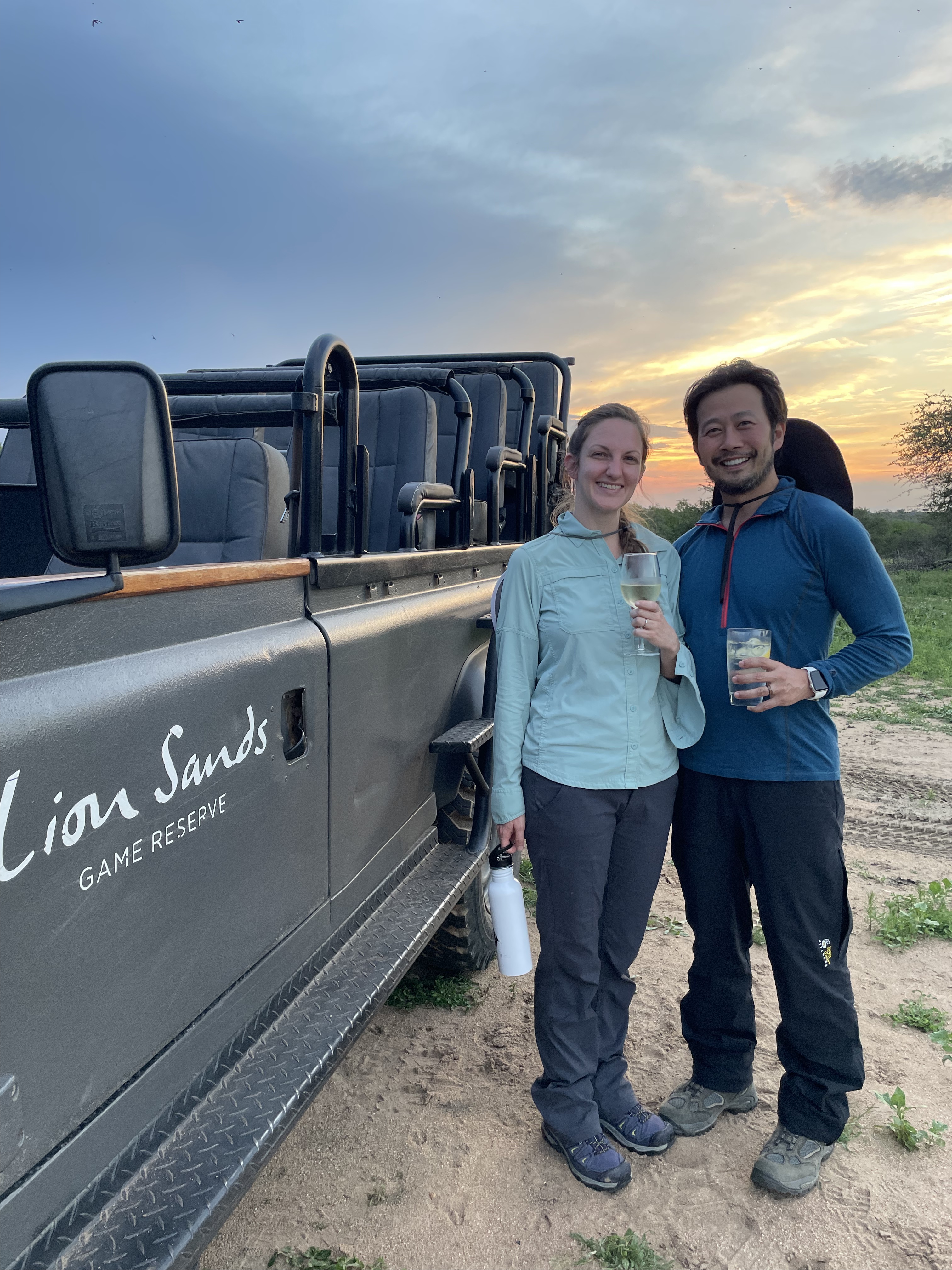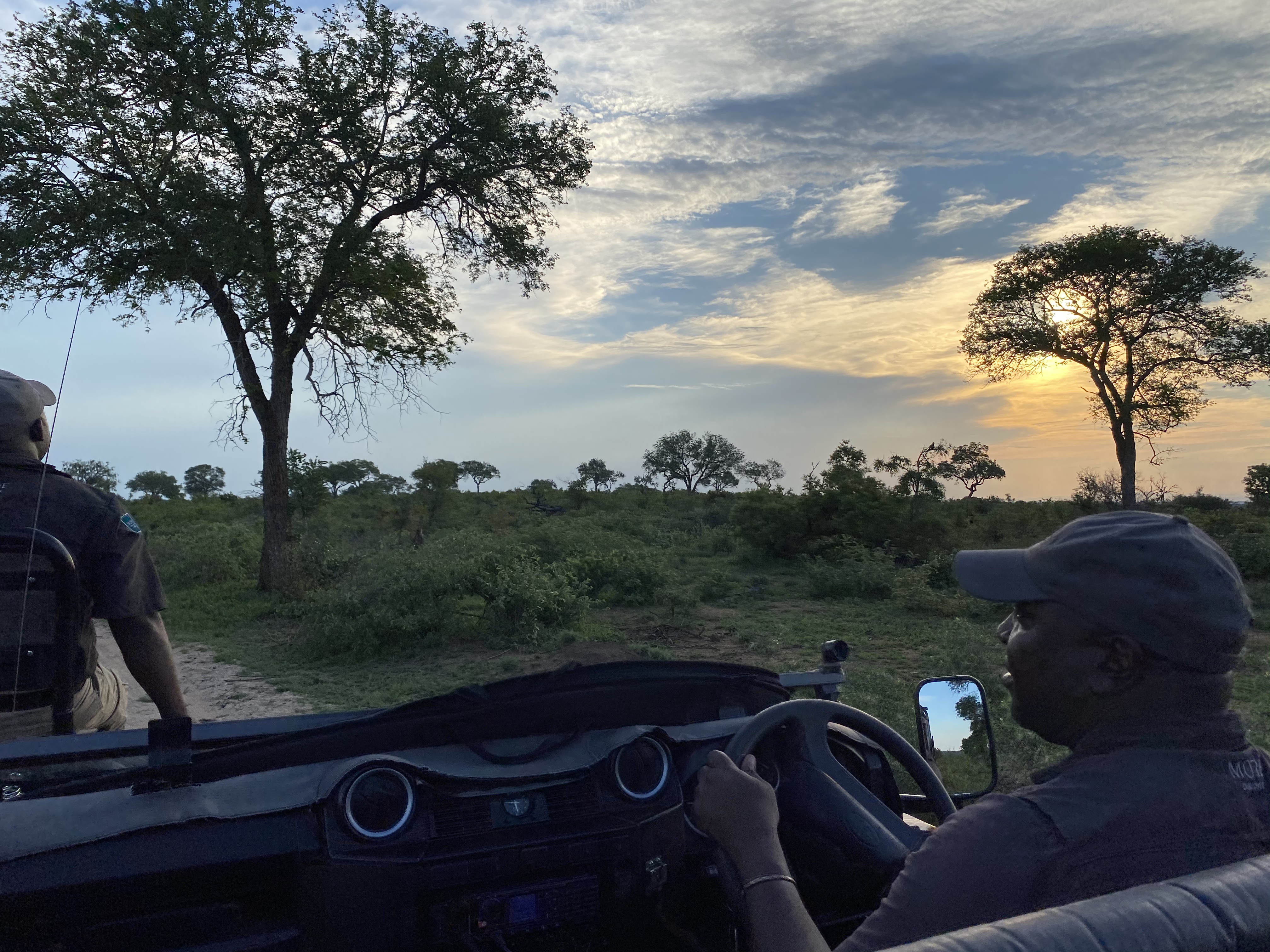 Our first game drive did not disappoint! We saw elephants, giraffes, impalas, kudu, buffalo, warthogs, and a rare pangolin. Pangolins are difficult to find because they are one of the world’s most poached and trafficked animals. Our guide, who had been working in wildlife for over 20 years said he had only seen 3 or 4! When it got close to sunset, we stopped in an open area for drinks and a snack and our guide and tracker switched over to bartenders. There was another cool couple from Botswana with us, and they told us that when in the bush, the drink of choice is gin and tonic. I had already opted for a glass of refreshing white wine, but we all cheers’d for some in-the-bush camaraderie and enjoyed the beautiful sunset together.