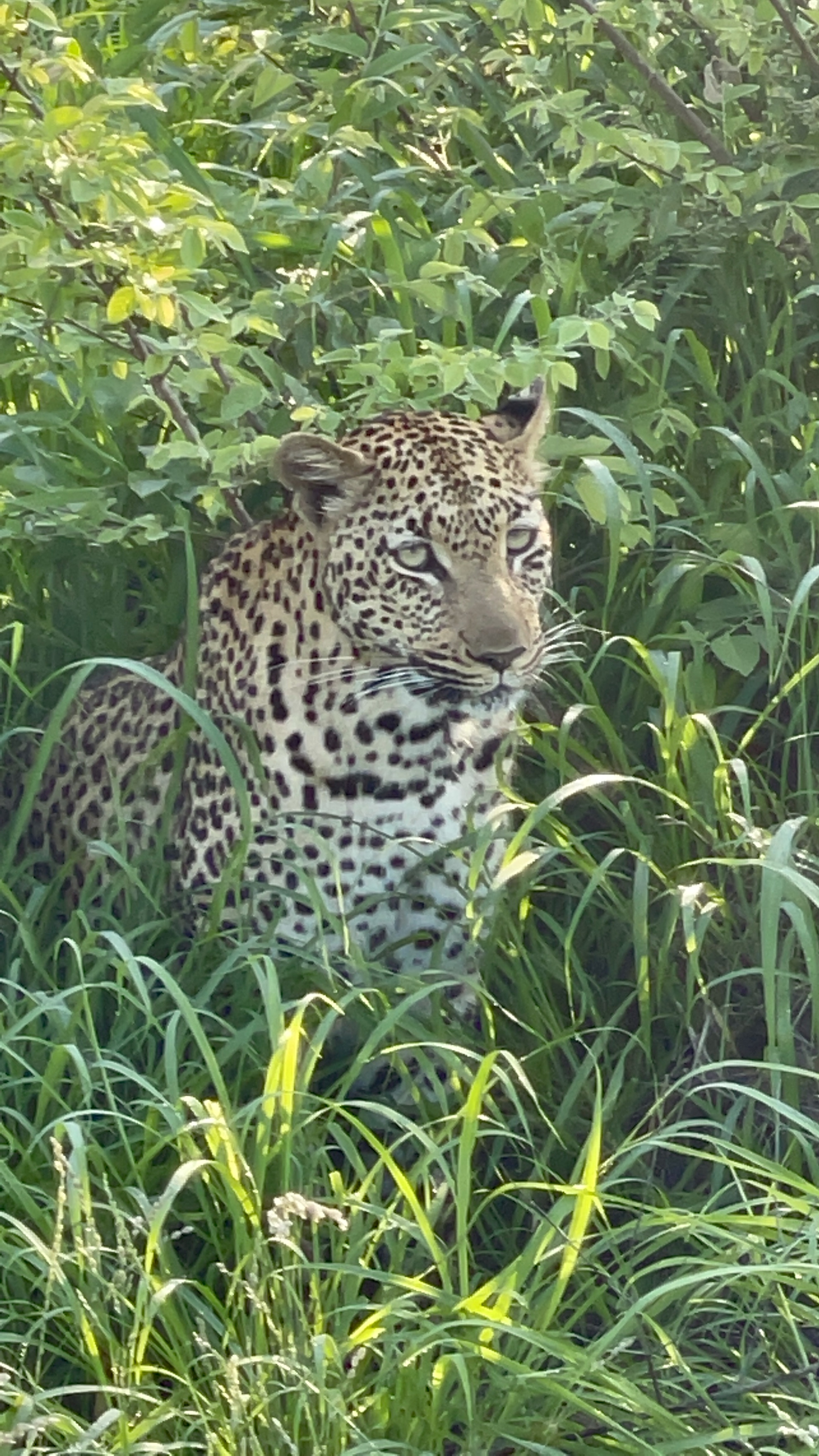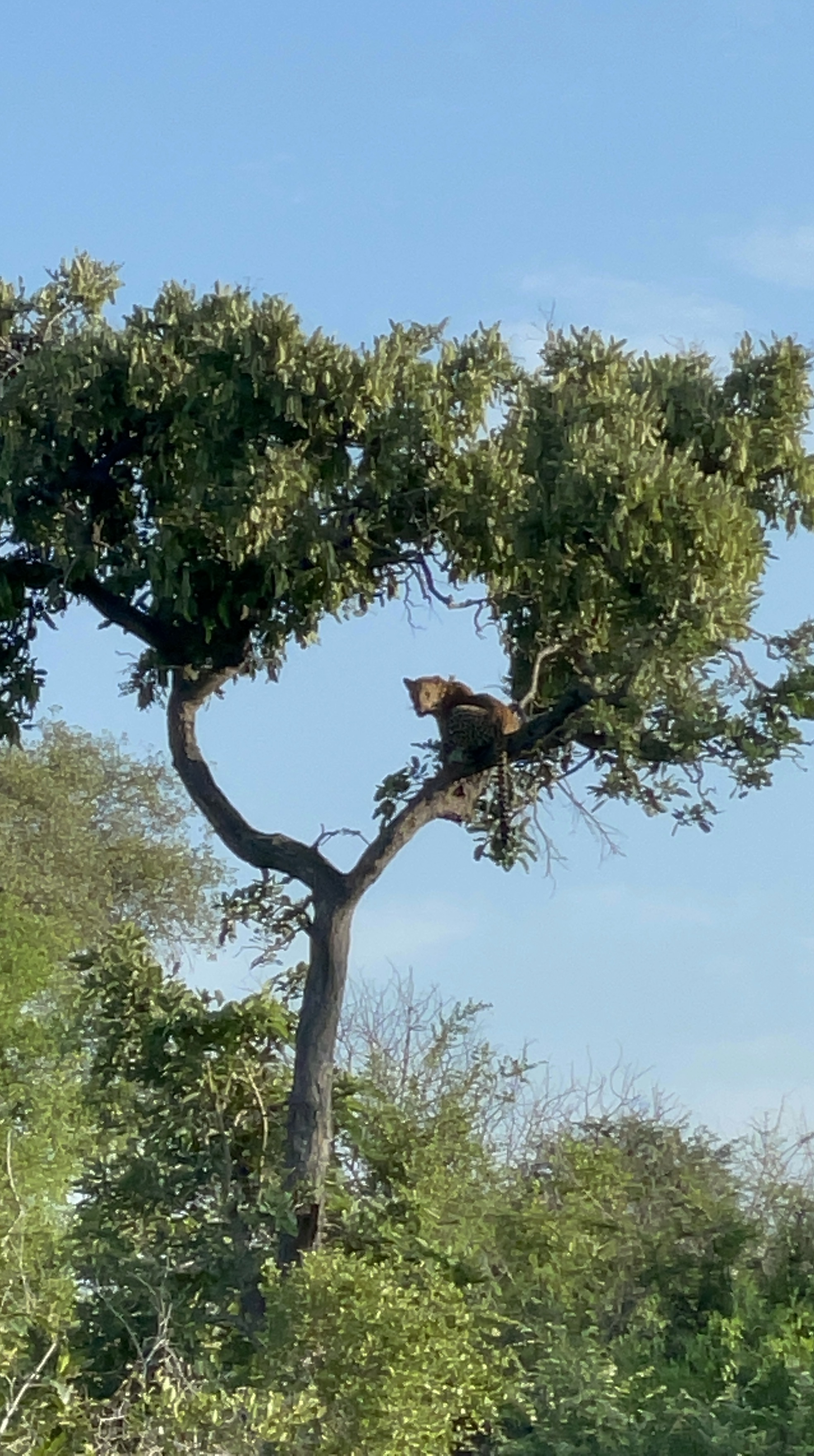 And sure enough, in the next tree over, I spotted our first leopard! Wow! In a tree! Our guide drove closer to the tree, and we watched this beauty climb down off the tree. We followed her into the brush with the vehicle as she jumped down. Apparently there are some types of animals that guides are allowed to follow into the brush and others they aren’t. Cats can be followed. We finally found her huddled down next to a bush, and our jeep got so close to her on my side of the car, I probably could have touched her if I put my hand out. Don’t worry, I would NEVER do that. Number one rule of safaris, DON’T STAND UP, and don’t try to touch animals. Someone told us leopards are small… NOT true!