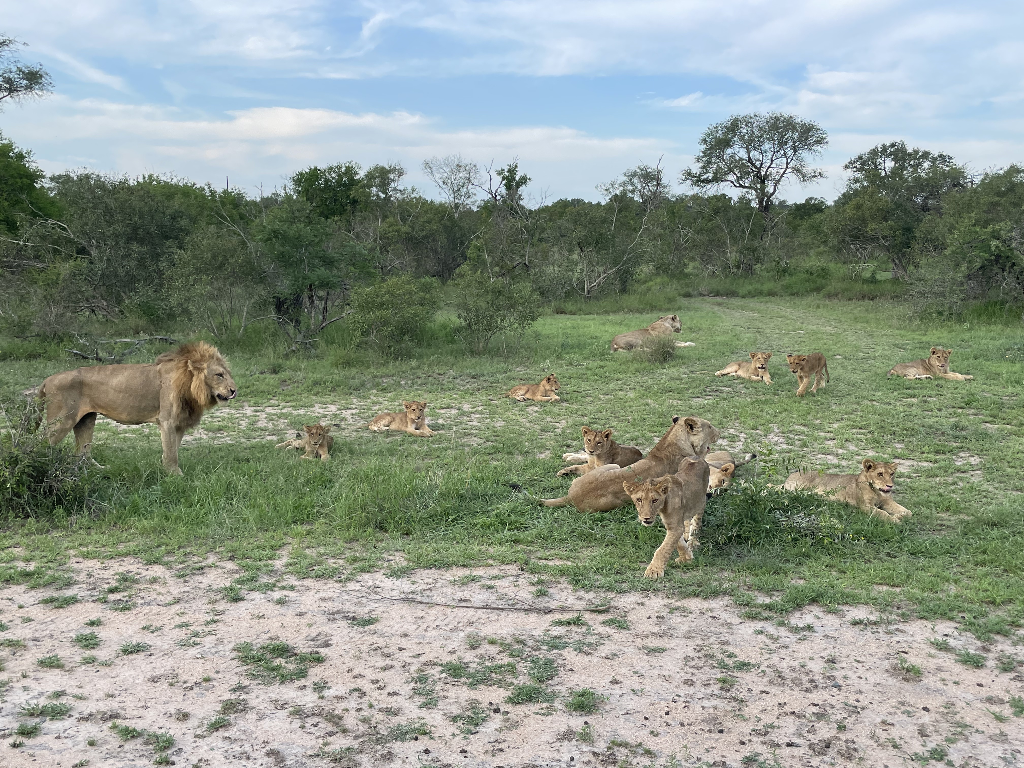 On our evening game drive, back with our Botswanian friends again, after searching high and low, we finally found lions! A pride of around 15 – one male, several females, and tons of cubs of various ages! Incredible, majestic, terrifying! We sat with the car about 10 feet away from the closest lions and watched as the sun lowered in the sky for a good 20 minutes. When we first drove up, of course the lions were on the same side as us 2 women. We bonded in anxiety over how close we were to these massive creatures until our guide finally moved the car around so the lions were on the guys’ side of the car. The lions were mostly taking their mid-afternoon nap. The moms were trying to get a little rest away from the little ones, but the little cubs, full of energy of course, kept pouncing around waking their moms trying to get some milk. A few moms got a little cranky about it and there were some hisses and growls and low grunts. Eventually, they lions got up and one by one made their way away out of the little peaceful area where we all waited and made their way towards wherever their lion journey would take them next.