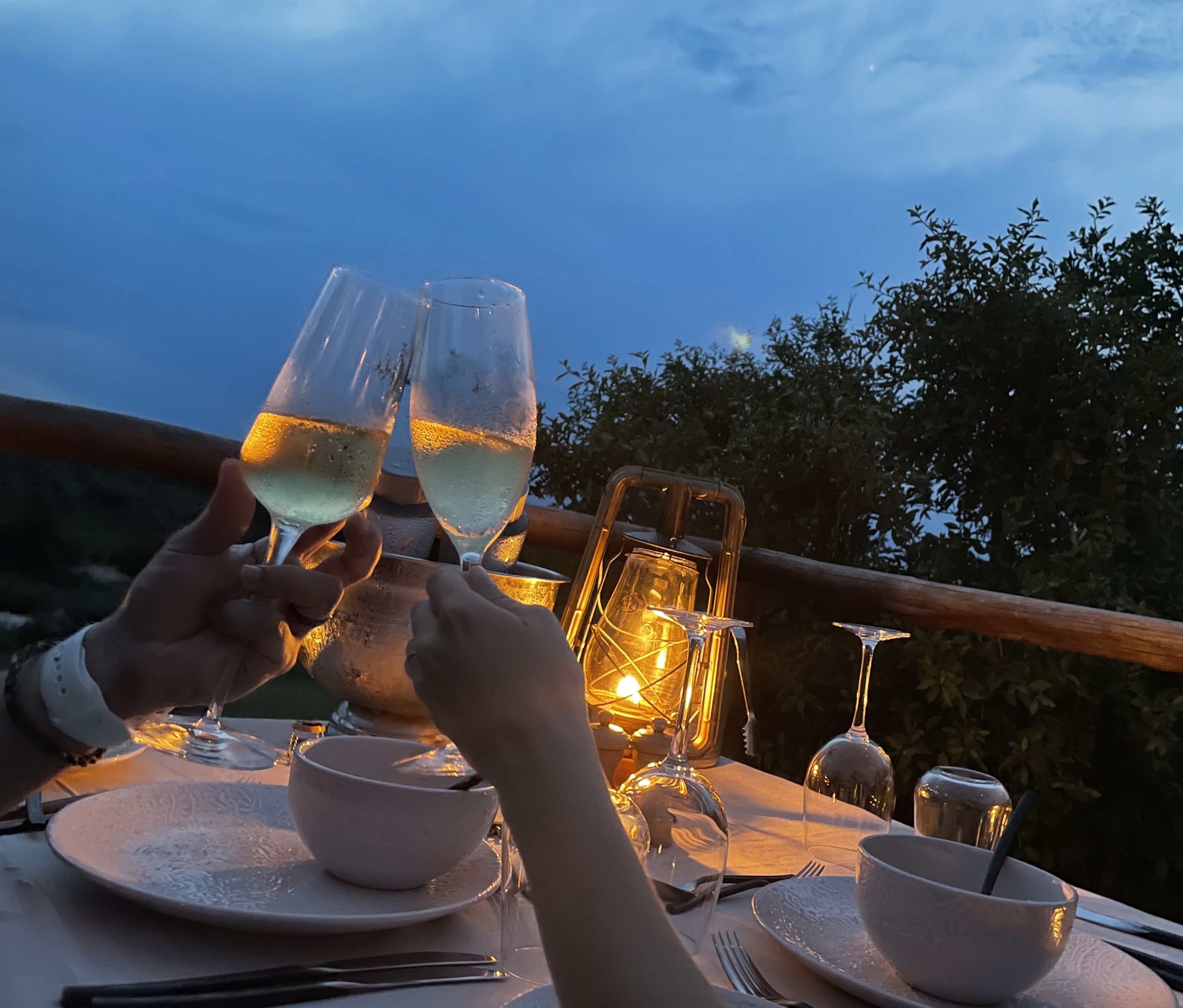 At the end of the 2nd day’s evening game drive, Kurt and I were dropped off at the luxurious Tinyeleti Treehouse! Think of this as a complex and beautiful treehouse about 2-3 stories high in the middle of the South African bush with a comfortable bed and shower and toilet but in the middle of nature with no walls. A romantic 3 course dinner had already been prepared and locked up in cabinets for us to serve ourselves under the lantern-light. There was also ample wine and a complementary honeymoon bottle of champagne waiting for us. We were given a flashlight, a cell phone, and a radio in case we needed rescuing, but we honestly felt pretty safe.