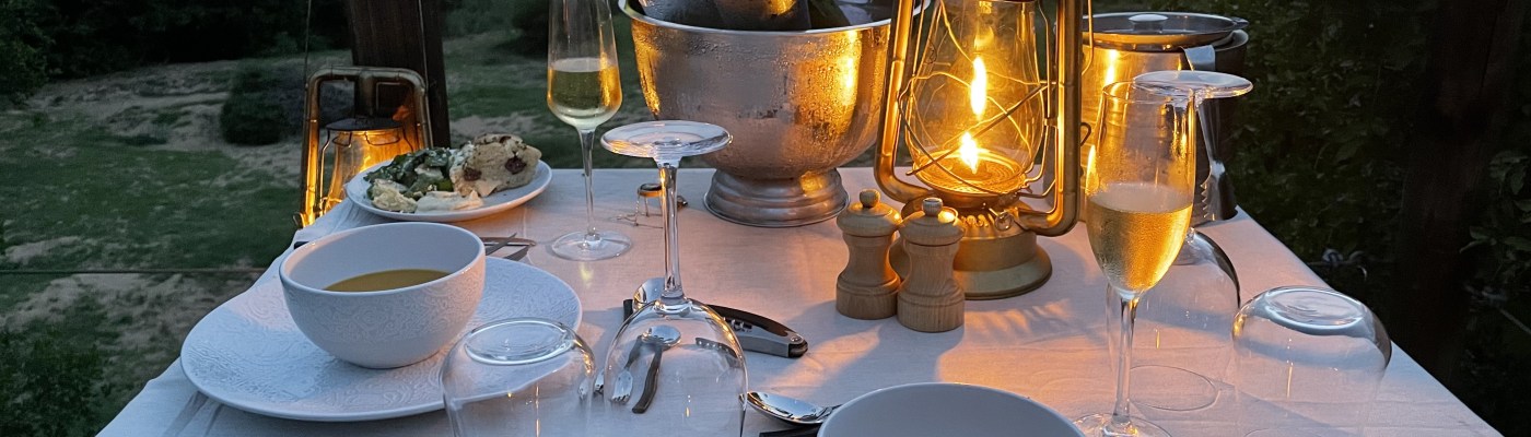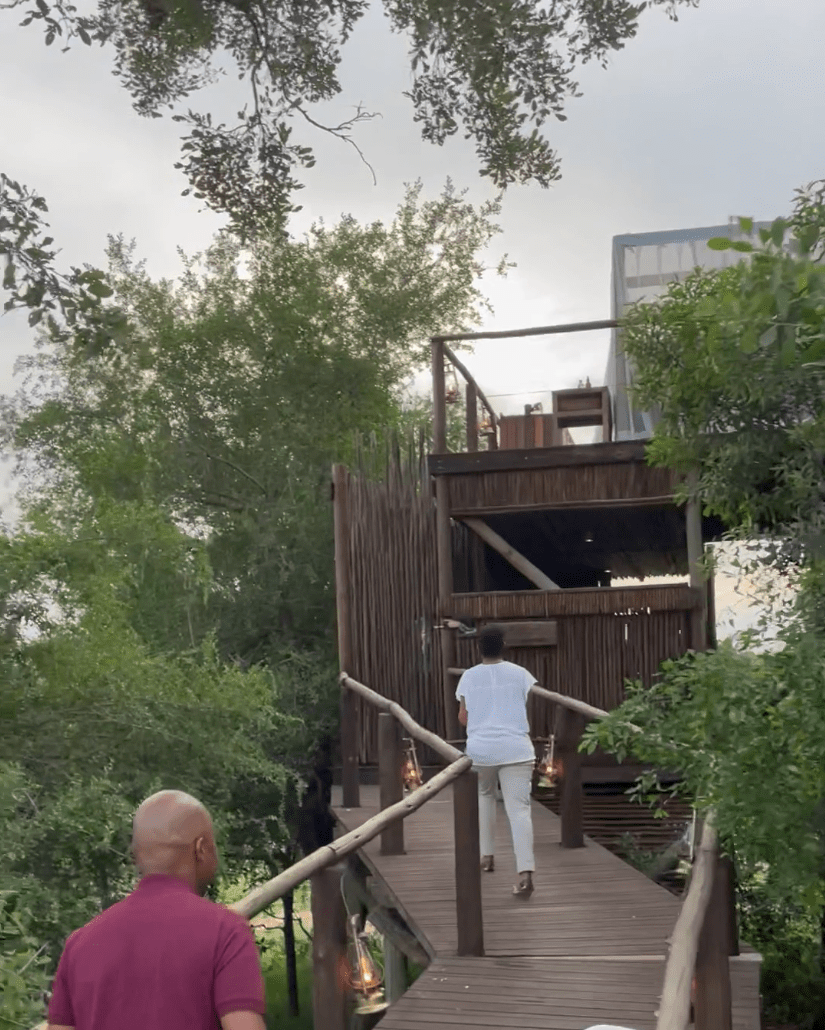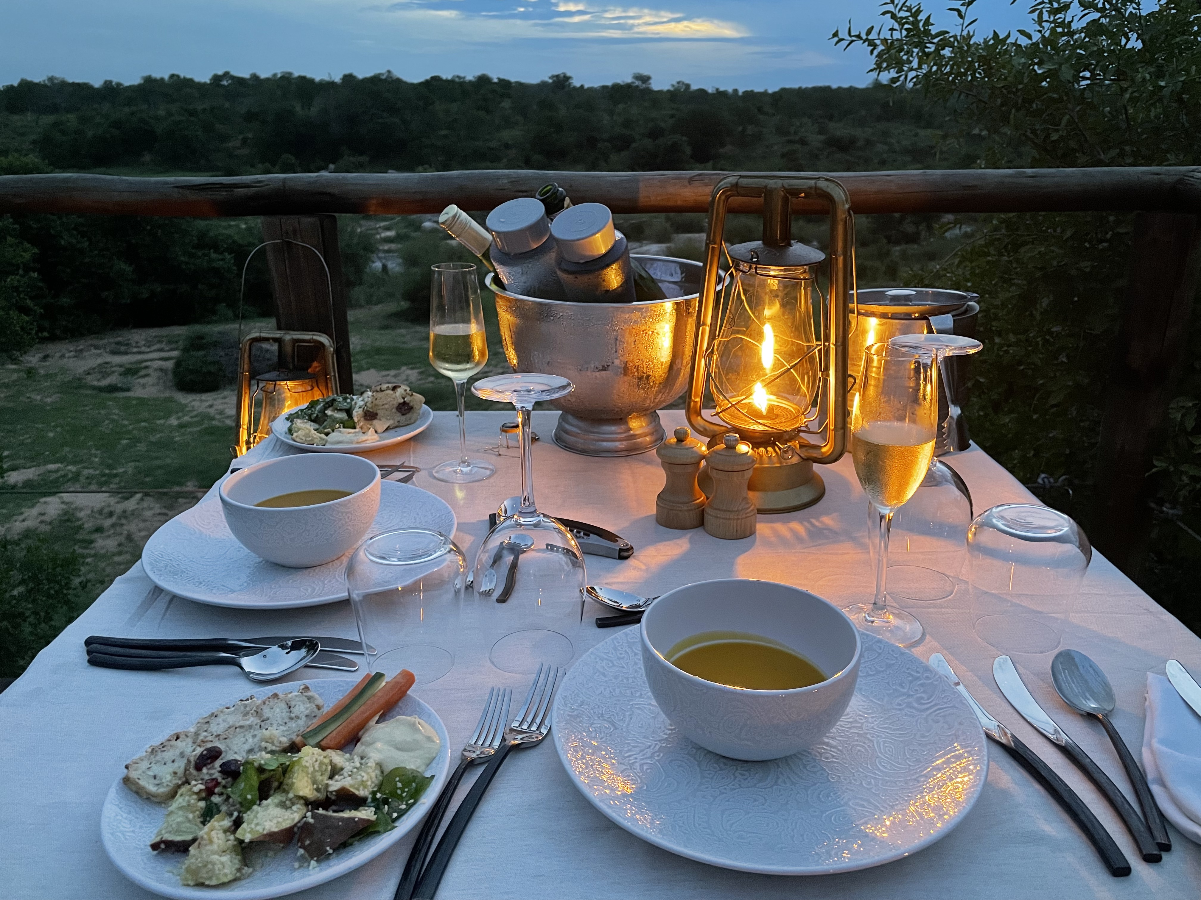 At the end of the 2nd day’s evening game drive, Kurt and I were dropped off at the luxurious Tinyeleti Treehouse! Think of this as a complex and beautiful treehouse about 2-3 stories high in the middle of the South African bush with a comfortable bed and shower and toilet but in the middle of nature with no walls. A romantic 3 course dinner had already been prepared and locked up in cabinets for us to serve ourselves under the lantern-light. There was also ample wine and a complementary honeymoon bottle of champagne waiting for us. We were given a flashlight, a cell phone, and a radio in case we needed rescuing, but we honestly felt pretty safe.