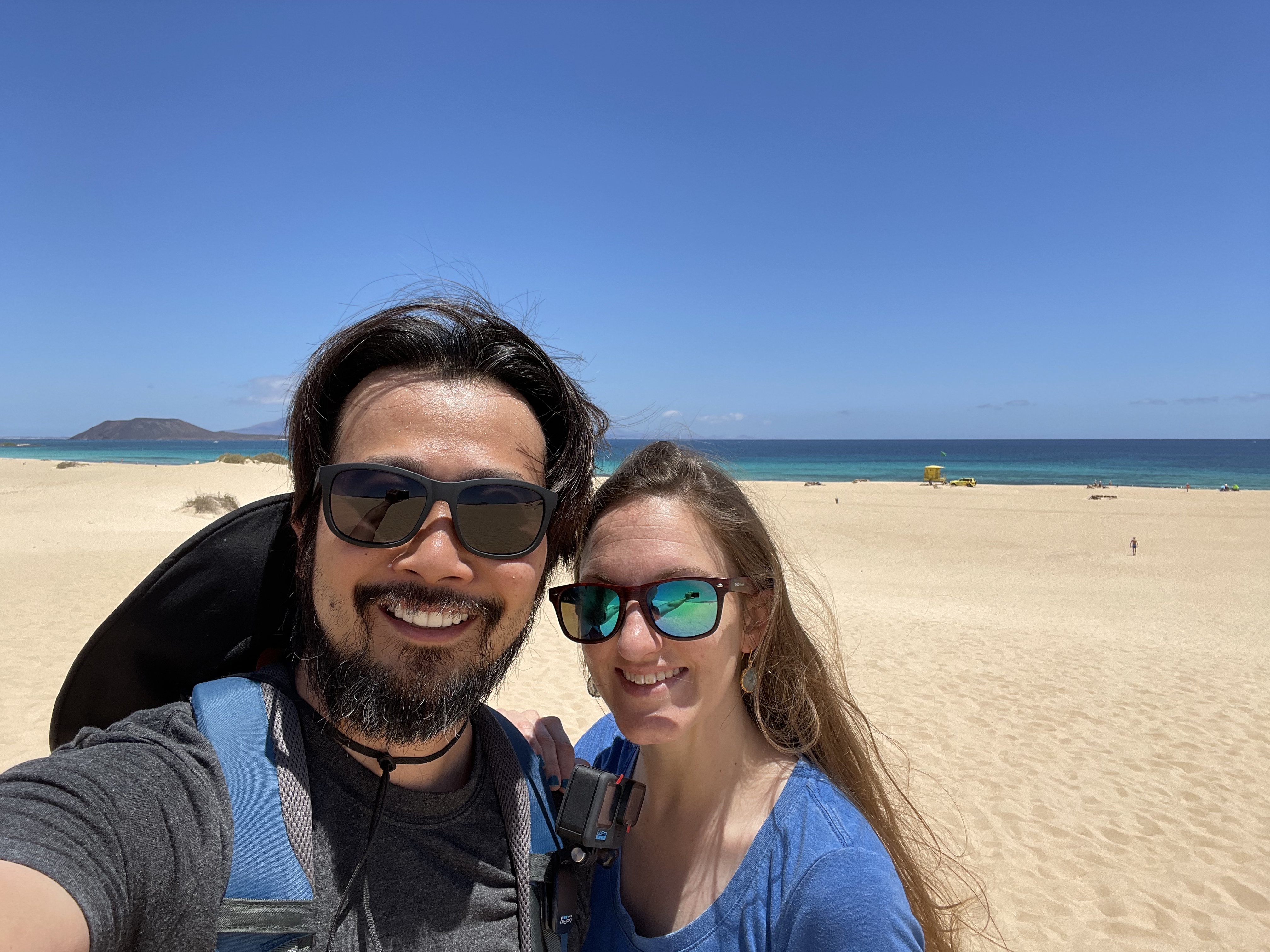 The next morning, we drove about 30 minutes to the town of Corralejo and Corralejo Natural Park, where you can find smooth and silky sand dunes running right up to the clear water that fades out in varying shades of blues and teals. Stunningly beautiful, the weather a cool 75 degrees (though add in the sun to this literal desert island and it feels like 95). We put on our hiking shoes and made our way over the dunes to the beach. We took off our shoes, so we could walk along the beach a bit and let the cold water cool us down. Kurt had his go-pro clipped on to his shirt so he could film as he walked. We had only gone a few steps when we noticed a completely nude couple walking unapologetically towards us. Hahaha. I forgot this was Spain. Kurt quickly turned off his go-pro and we continued to enjoy our walk down the beach. I estimated about 25% of the people were at least partially nude; Kurt said it was only about 10%. He’s usually way better at estimating numbers than me, so he’s probably right, but I’m still going with a quarter. It’s always kind of freeing to be somewhere where people go how they want and no one seems to care either way.